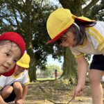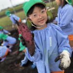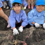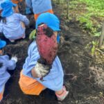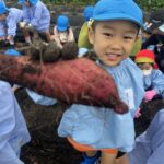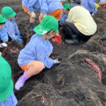 今年の芋ほりも、豊梅園さんにお世話になりました。少し肌寒い日で小雨の心配もありましたが、お天気もなんとか持ち直し、泥まみれになりながら掘ってきました!もぐらになって、掘っても掘っても、掘っても掘っても…なかなか全部の姿は見えません。やっと姿を見せてくれたお芋は、自分たちの顔よりも大きな大きなお芋でした。