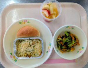 「コッペパン、マカロニグラタン、ブロッコリーの玉ねぎドレッシング、フルーツのゼリーがけ」